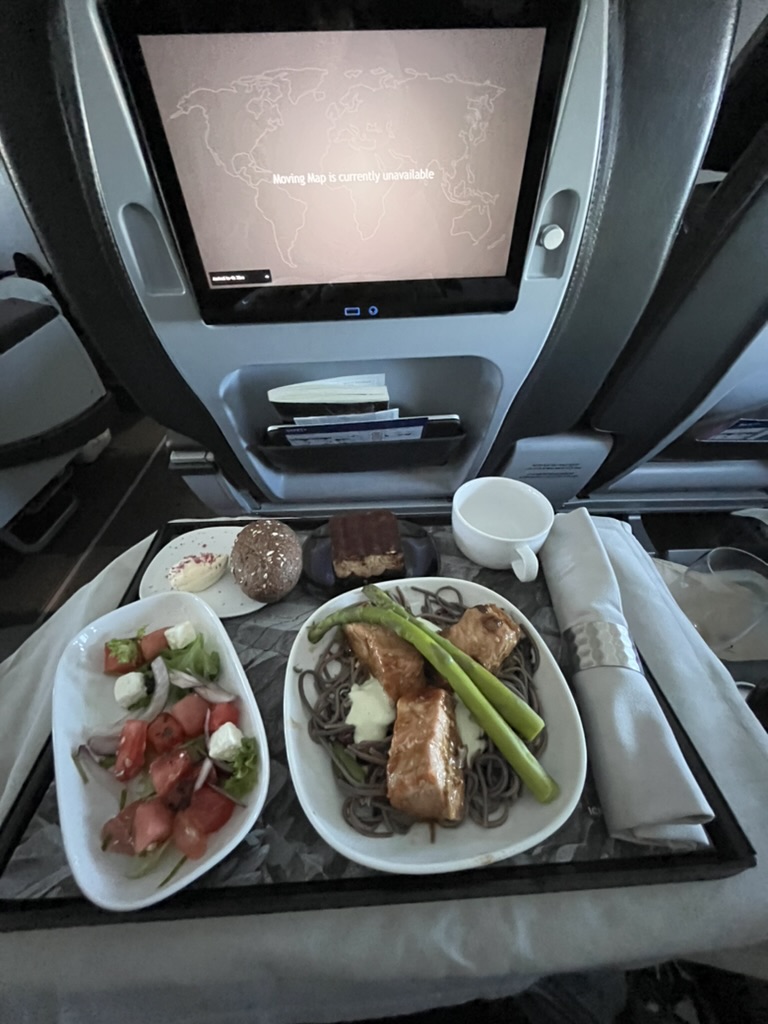 Business class! Kyllä. Oikeat metalliset ruokailuvälineet ja nuudelilohi. Silti ehkä tärkeämpää on se että tuossa on vain kaksi penkkiä rinnakkain tilassa johon economy-luokassa laitetaan kolme. Aika paljon mukavampi istua ja nukkua.